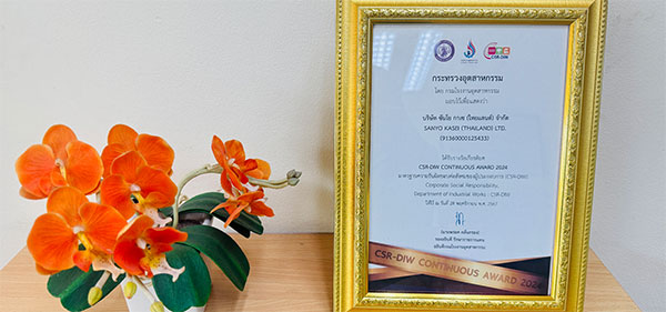 Sanyo Kasei (Thailand) Ltd. has received the CSR-DIW Continuous Award for 10 consecutive years since 2015 as an organization that actively engages in social responsibility initiatives, adheres to ethical business practices, and actively contributes to the welfare of society and the environment.