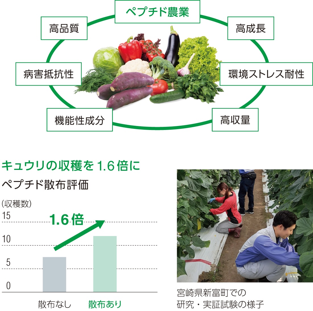 当社では、植物に不足している性質を発現させ、従来の品種改良と比較して安心で簡単に植物のさまざまな機能を引き出すことができる農業用ペプチド※の活用を研究開発しています。気候変動などによって植物が受けるストレスに対する耐性を付与することで、農作物の収量や品質の向上が期待できることから、新たなペプチド農業の確立と農業支援を本格展開していきます。