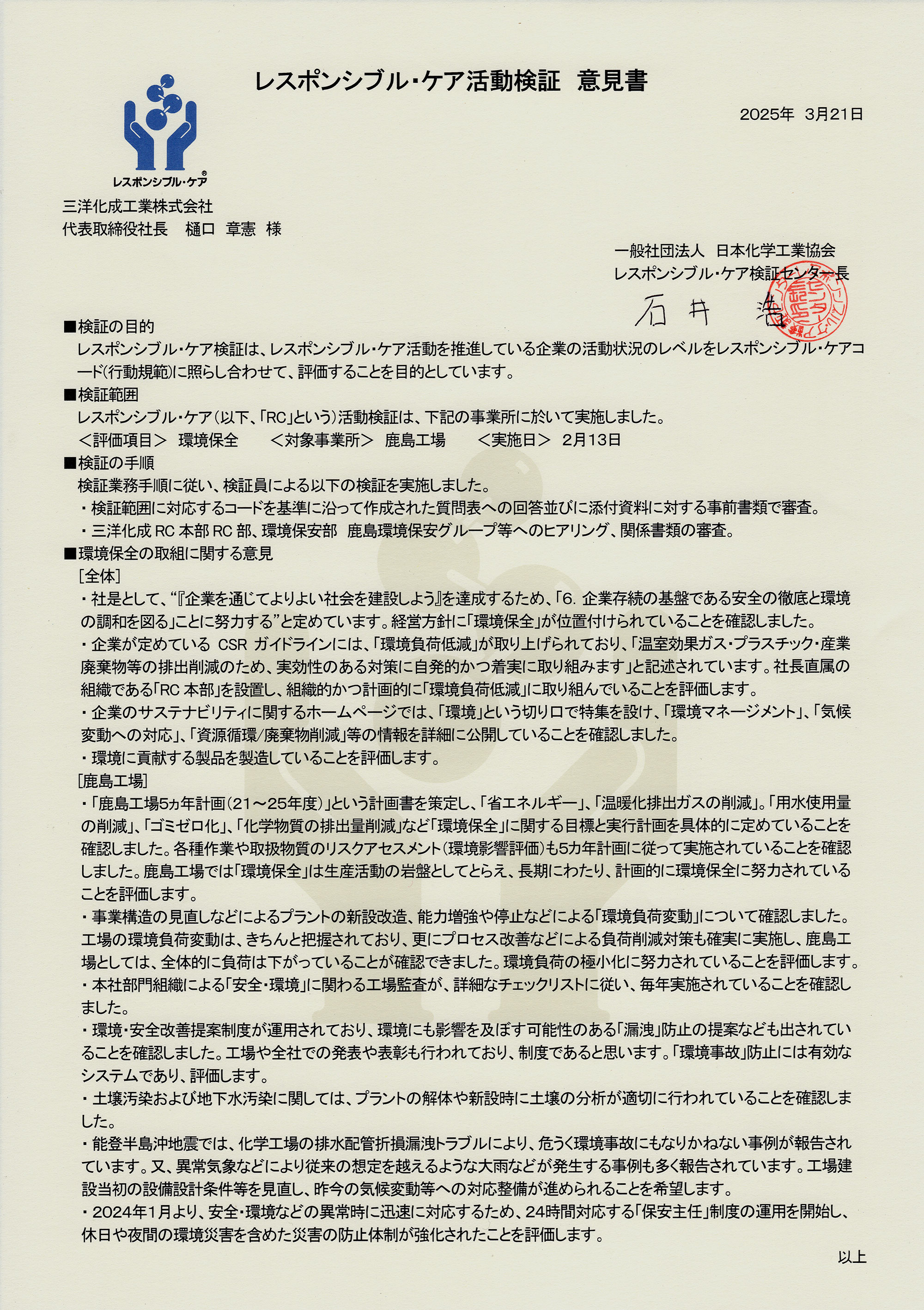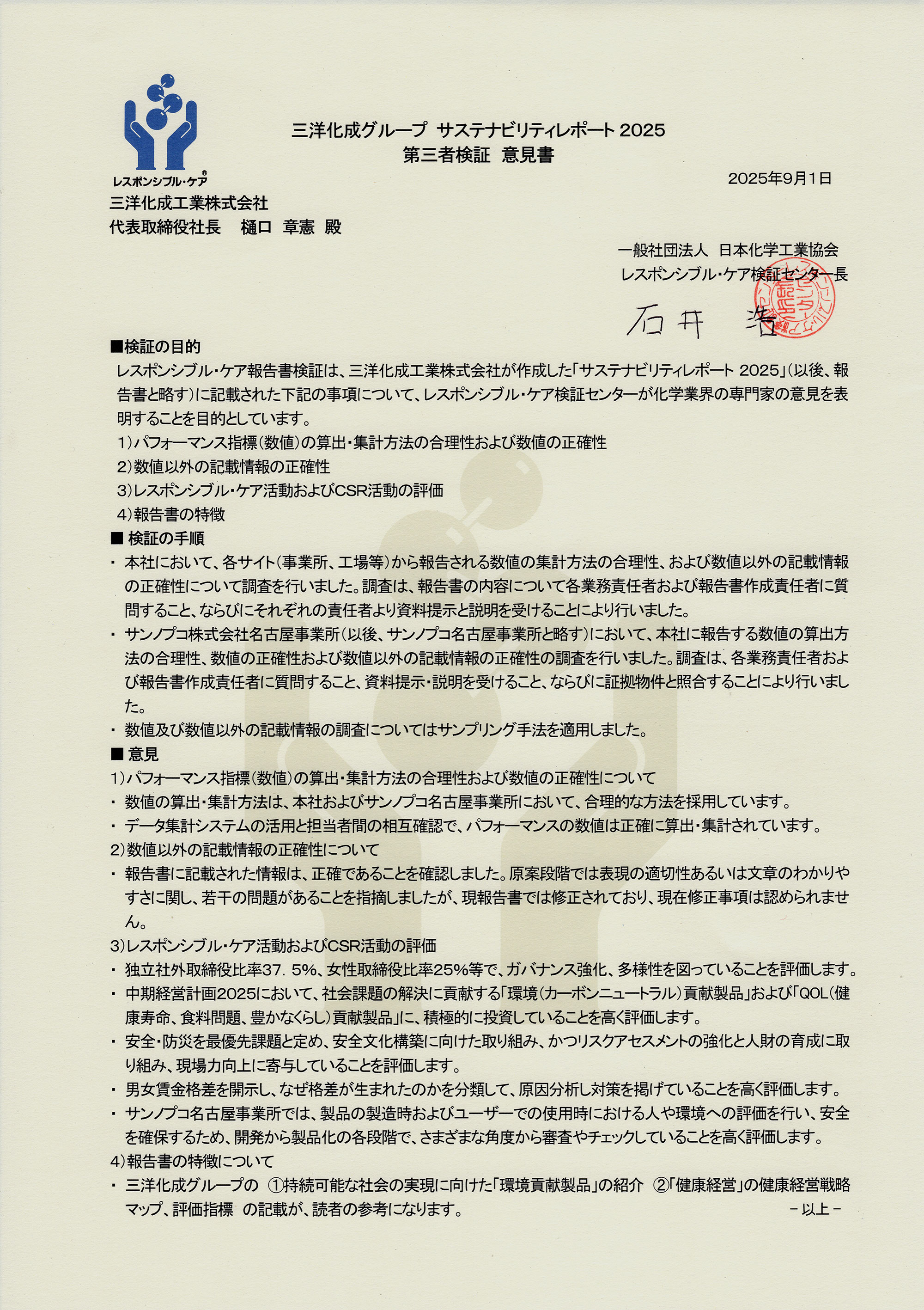 報告書の内容について、RC活動の内容を第三者である一般社団法人日本化学工業協会レスポンシブル・ケア検証センターの検証を受けています。