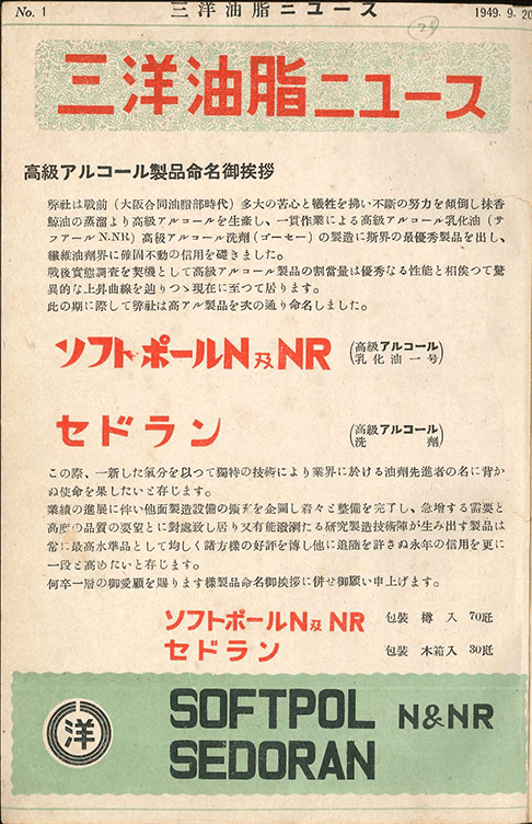 企業広報誌として1949年の創立とほぼ同時に発行された『三洋油脂ニュース』第1号。技術や製品など、自社に関する情報を多く掲載していました。