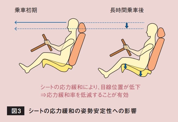 自動車シートの乗り心地性能は、大きく分けて二つの要素から構成される。1点目は道路や車体から伝わる振動に対する快適性であり、人間の体は6Hz近辺の振動を最も不快に感じることから、特に6Hzの伝達率を下げることが有効と考えられている[図 1]。2点目は、座り心地である。シートが搭乗者の体の形や動きにフィットすることで、姿勢安定性が高まり座り心地が向上する[図 2]。姿勢安定性には長時間着座した後でもシートのたわみ(応力緩和)がないことも重要である[図 3]。体への負担だけでなく乗車初期と長時間乗車後で運転者の目線位置が変化すると安全上の問題も生じるからである。