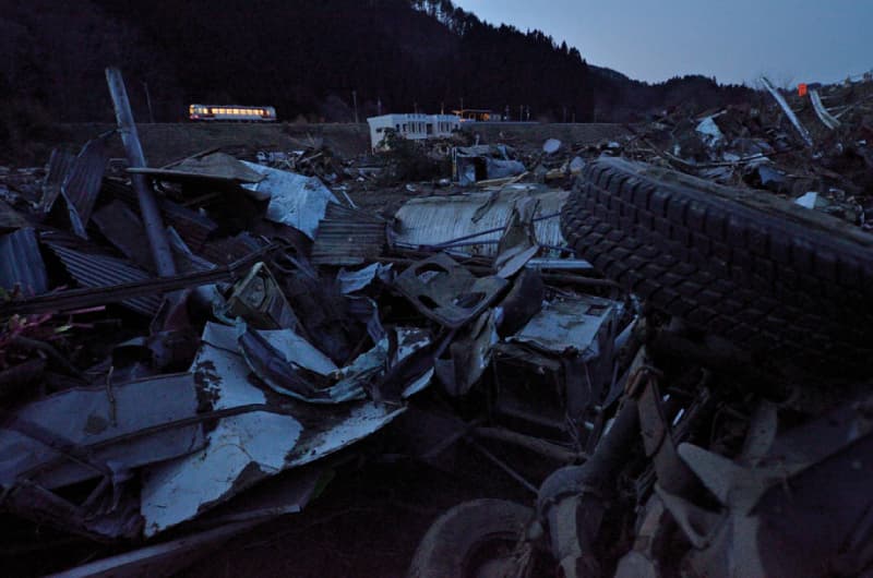 下の写真は震災から約1カ月後の4月6日に北リアス線の田老駅で見た光景です。自衛隊によって道路は通行可能になっていましたが、一面瓦礫に覆われた沿線はまだ停電したままで、時折通る車以外に灯りは一つもありません。音もなく、潮とガソリンの入り交じった臭いだけが鼻をつくその光景は、まさに地獄絵図。その時遠くから警笛が聞こえ、車内灯を煌々と輝かせた復興支援列車が姿を現しました。それはまさに絶望が支配した暗闇を照らす、希望の灯火に思えました。僕は号泣しながら撮影しました。