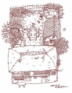 水戸岡さんが描いた生家の庭には家族で朝食を囲んだテーブルが。