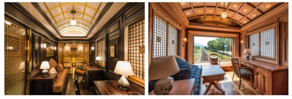 木材や和紙などの天然素材のほか、大川組子や有田焼といった伝統工芸を生かした「ななつ星 in 九州」(撮影:Studio NEXT 黛 宏幸)