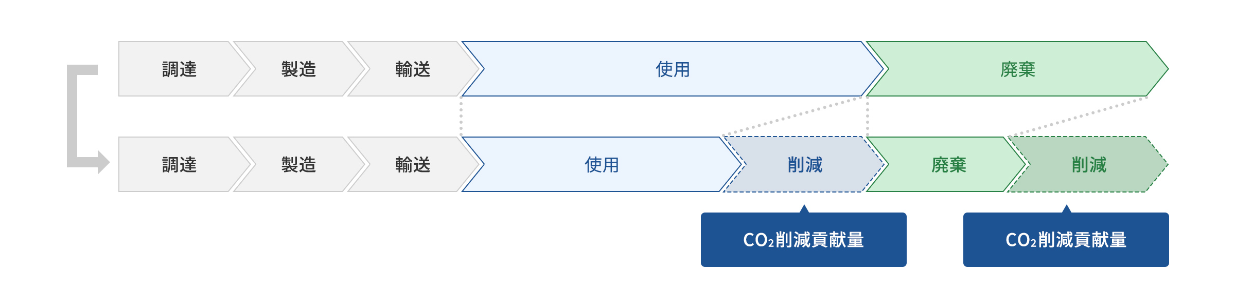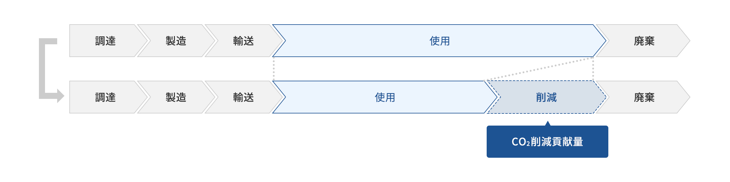 - CO2削減貢献量の算定にあたり、調達段階と製造段階については、比較対象となる当社既存製品との差異が小さいため除外し、使用段階と廃棄段階のインパクトから算出しています。