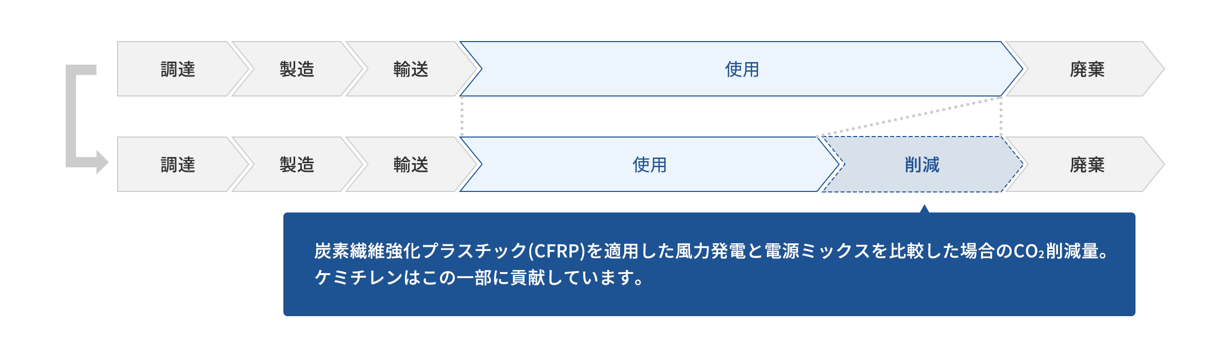 ケミチレンは、CFRPを適用した風力発電によるCO2排出量削減の一部に貢献しています。