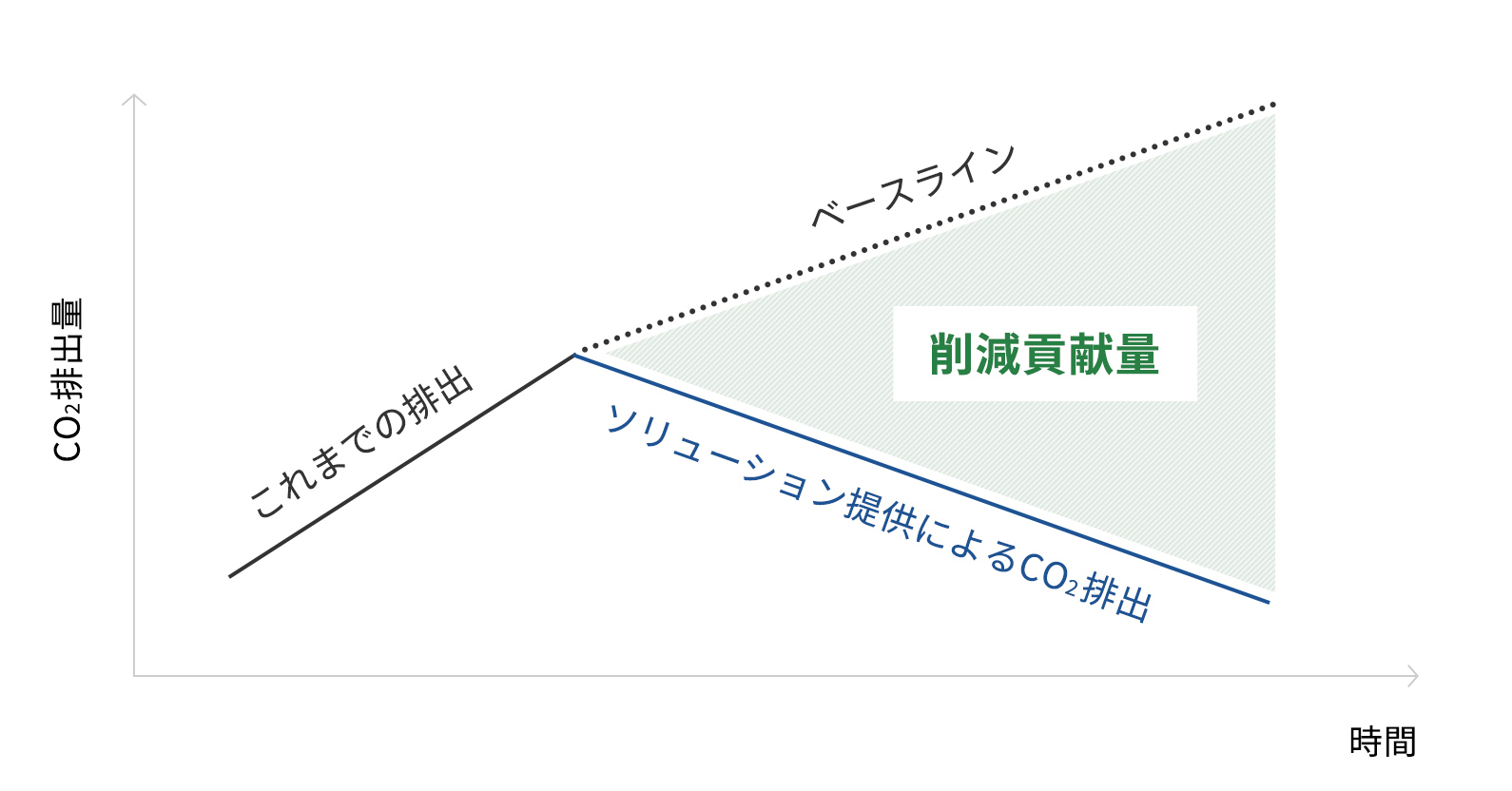 CO2削減貢献量とは、従来の製品・サービスと新たな製品・サービスのCO2排出量の差分であり、製品・サービスを通じて社会全体の気候変動の緩和への貢献を定量化したもので、一般的に、以下のとおり算定されます。