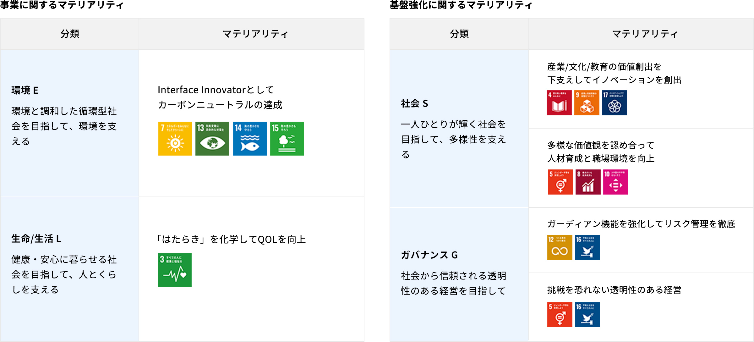 E(環境)、L(生命/生活)分野を事業に関するマテリアリティとし、S(社会)、G(ガバナンス)分野を基盤強化に関するマテリアリティとして、計6つを特定しています(QOLの向上に関する期待・貢献の象徴として従来のESGからLの分野を切り出し分類)。